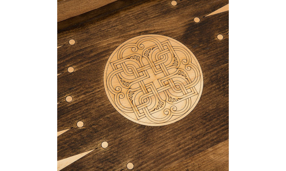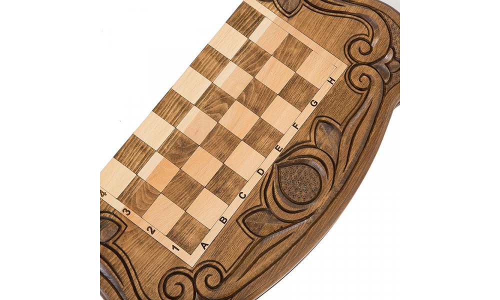 Сама форма доски уже привлекает внимание, ведь это не банальный прямоугольник, а интересное изделие с округлыми гранями. С одной стороны здесь имеется поле для шахмат, вокруг которого выполнено мелкое рифление. С его помощью также можно сыграть и в более простые шашки, используя комплектные фишки. Обратная сторона предназначается для игры в нарды, поэтому тут каждая ячейка подчеркнута рисунком в виде удлиненной капли, а по центру находится круг, украшенный геометрическим узором.